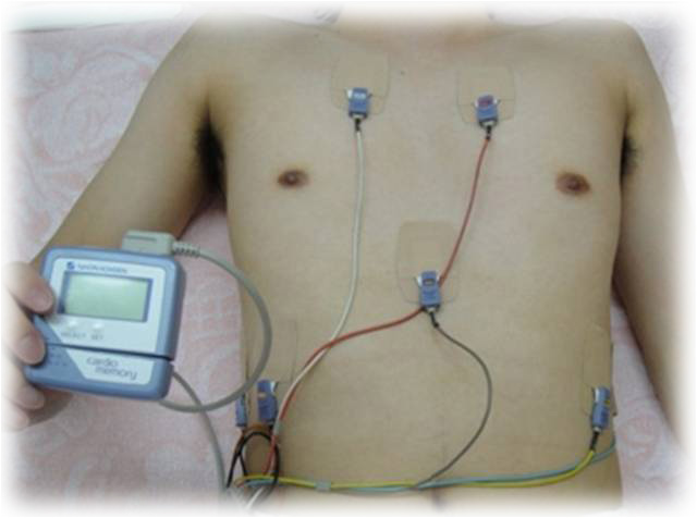 24時間、小型の心電計を装着し、日常生活中の心電図を記録します。この検査は、不整脈、狭心症、薬の治療効果をみるのに有用で、また症状と心電図の関連があるかということもわかります。