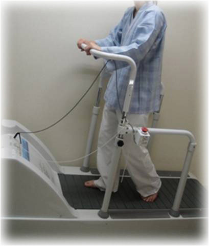 小型心電計と血圧を装着し、トレッドミルの上を歩く〜